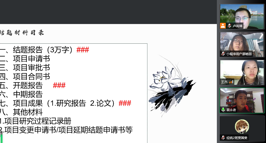 为做好2019-2020年度学院大学生创新创业训练计划项目结题工作,更好地将创新创业教育融入学院人才培养之中,营造良好的创新创业氛围。学院于10月8日19:00,以“挖掘CNKI应用,助力创新创业”为主题,在线举办经济学院大学生创新创业项目专题辅导讲座。我院2019级贾国荣和2018级夏永奇同学分别作了CNKI应用和大学生创新创业项目结题经验分享。学院2019级、2020级大创项目负责人及项目成员聆听了讲座。