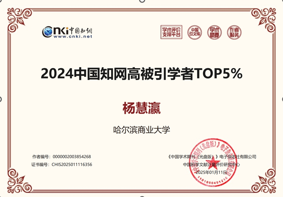 近日,中国知网公布了“2024中国知网高被引学者预发布名单”,哈尔滨商业大学经济学院4位学者入选。其中,杨守德入选应用经济学中国知网高被引学者TOP1%;符建华、杨慧瀛、潘鹤思三位教师入选应用经济学中国知网高被引学者TOP5%。