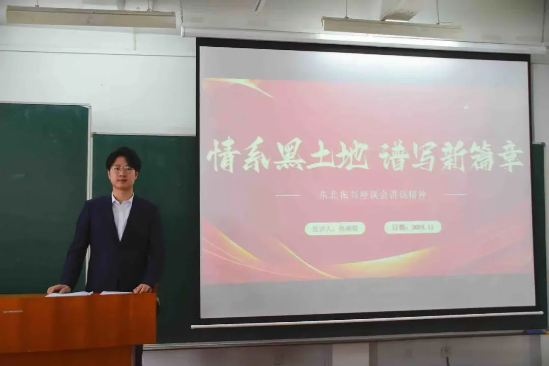 为深入学习贯彻习近平总书记在新时代推动东北全面振兴座谈会上的重要讲话精神,鼓励青年学生发扬创新精神,为东北产业升级提供新思路、新技术,2024年11月28日,学院在A区教学楼0424教室开展了以“情系黑土地,谱写新篇章”为主题的宣讲活动,校级“青马工程”学生骨干理论宣讲团成员、校大学生传媒中心主任张森焙进行宣讲领学,经济学院“青马工程”全体学员、学院团委和学生会学生干部、2024级班长和团支书参加学习。
