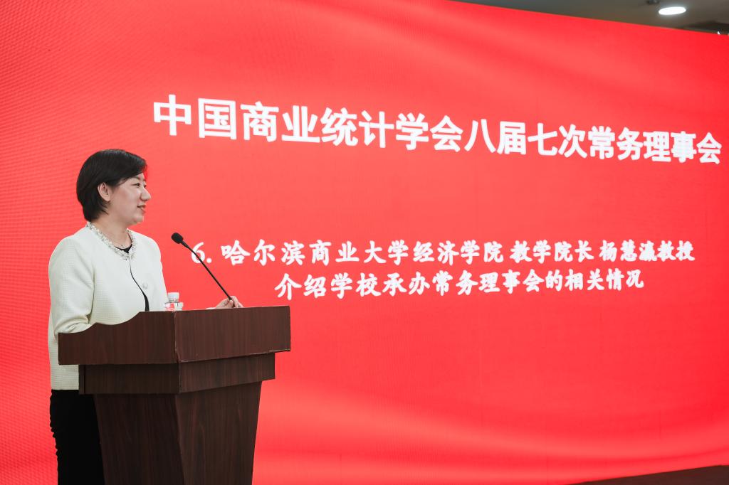 哈尔滨商业大学经济学院教学院长杨慧瀛教授、经济统计学教研室主任张恩英教授参加了本次常务理事会。杨慧瀛副院长代表学院在会上介绍了我校及我院办学历程、在学科建设、教学科研等方面取得的丰硕成果,以及我院承办学会八届六次会长办公会暨九次常务理事会的相关情况,并诚挚邀请中国商业统计学会会长、副会长、秘书长、各位常务理事及所有与会同仁明年此时到美丽的“尔滨”参会。