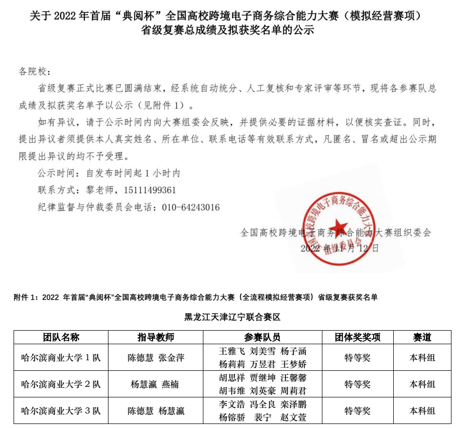 在经济学院领导的大力支持下,国际经济与贸易专业精心组织2020级国际经济与贸易专业本科生进行校级初赛,并从64名初赛选手中选拔出18名学生组成三支队伍参加省级复赛,经过近三个月的刻苦训练以及激烈角逐,在省级复赛中包揽黑龙江天津辽宁联合赛区本科赛道的前三名,获特等奖3项;在全国总决赛中获得本科赛道一等奖2项,二等奖1项。张金萍、杨慧瀛、陈德慧、燕楠四位教师获得优秀指导教师称号,哈尔滨商业大学获得最佳组织奖。
