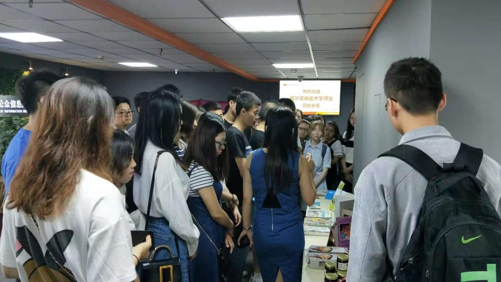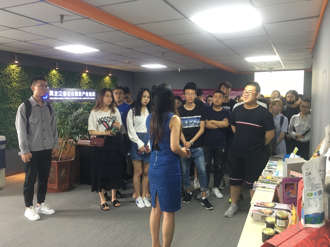 公司总经理李爽和运营总监吴红蕾热情地接待了师生一行,并在运营总监吴红蕾的带领下参观走访了黑龙江信息港的各个部门。吴总监详细介绍了公司发展历程以及跨境电商运营、跨境电商人才培训、电商云数据业务以及公司旗下网络冲印、土妞系列绿色农产品运营等电子商务相关业务。学生们不仅接触到了公司经营的各类产品,还实地观摩了跨境电商平台运营的操作流程。