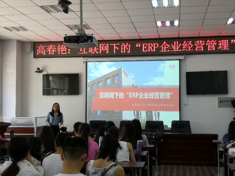 从哈尔滨商业大学国际经济与贸易专业历年毕业生就业行业和岗位分布情况来看,有一部分学生将会从事企业管理相关工作,而互联网和信息化是从事企业管理无法回避的行业背景。根据2016级国际经济与贸易专业学年实习计划和进程安排,2019年11月6日,国际经济与贸易教研室邀请本专业特聘的校外学生实习与实践指导教师,用友网络科技股份有限公司黑龙江省中心副总经理高春艳,为2019级109位学生做了主题为“互联网下的ERP企业经营管理”的精彩讲座。此次讲座在经济学院1102会议室举行,由经济学院国际经济与贸易专业负责人张金萍老师主持。
