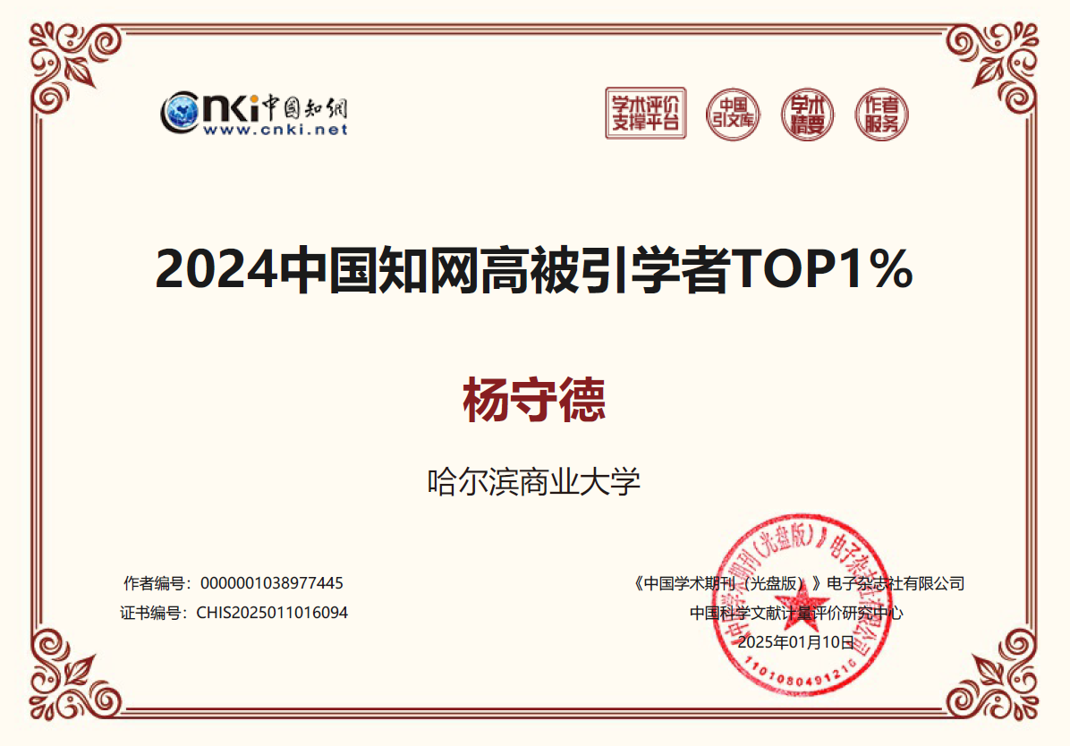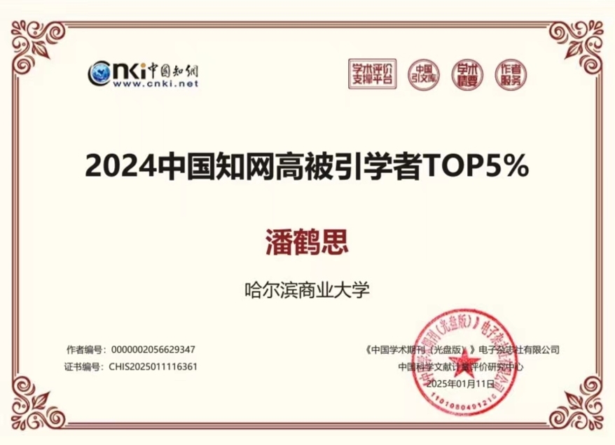 近日,中国知网公布了“2024中国知网高被引学者预发布名单”,哈尔滨商业大学经济学院4位学者入选。其中,杨守德入选应用经济学中国知网高被引学者TOP1%;符建华、杨慧瀛、潘鹤思三位教师入选应用经济学中国知网高被引学者TOP5%。