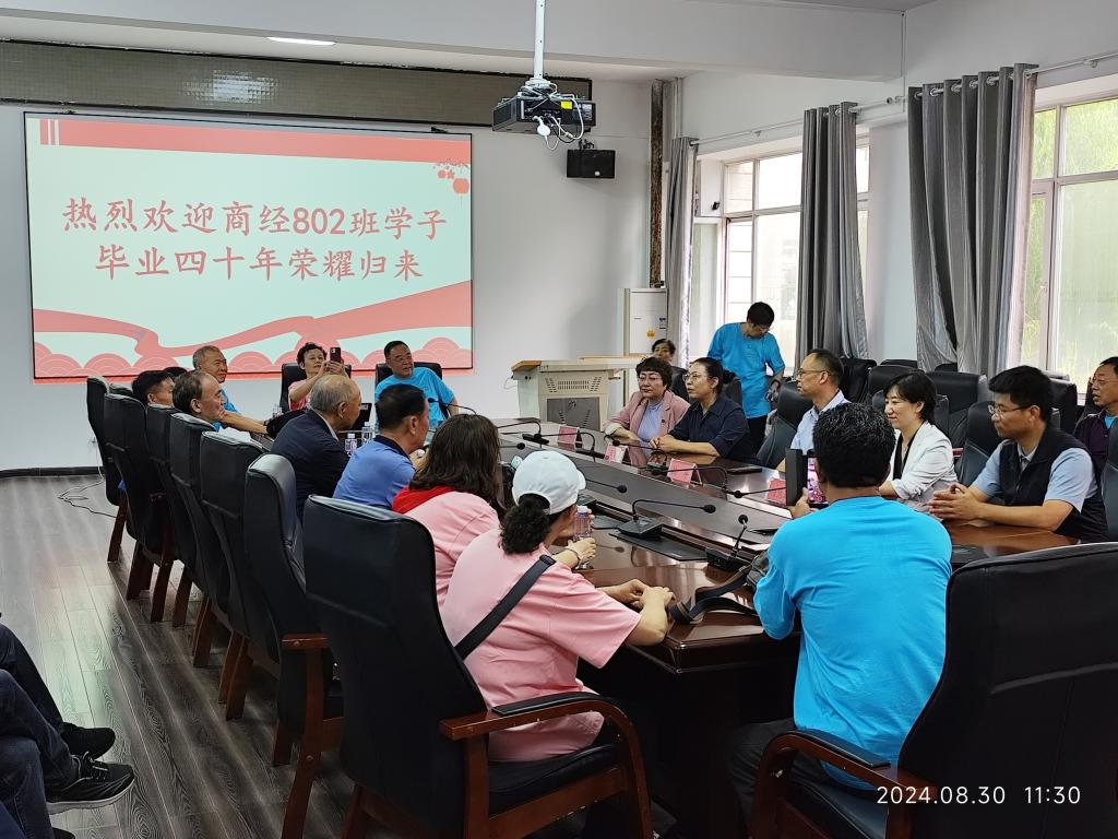 8月29日上午,在南校区教学主楼二楼会议室举行了“商经802班优秀校友毕业四十周年荣耀归来座谈会”。座谈会由校就业创业指导中心主任潘俊峰主持,副校长赵大伟、经济学院院长韩平、副院长韩朝亮,蒋孝洪(原经济学院党委书记)、王永发(原学工部部长)、张劲松(会计学院院长)、刘晓峰(原科研处处长)参加此次座谈。