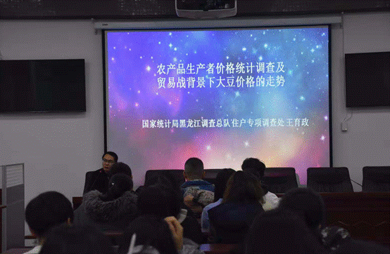 王处长先是对自己近期的统计工作做了简短的介绍,接着通过一张2019年上半年全国各省、市、自治区的主要生产者价格指数表,并结合生产指数进行了分析。然后,结合2017年统计出的最新数据,对我国及我省的大豆情况进行了具体分析。同时强调,黑龙江省是我国重要的大豆产区,保证着我国国内大豆40%的原料供应。贸易受阻,一定会催生国内大豆向着高品质、高效率、低成本的方向发展,对黑龙江省是一个巨大的机遇。讲座期间,对于同学们的相关问题,王处长耐心地进行一一解答。