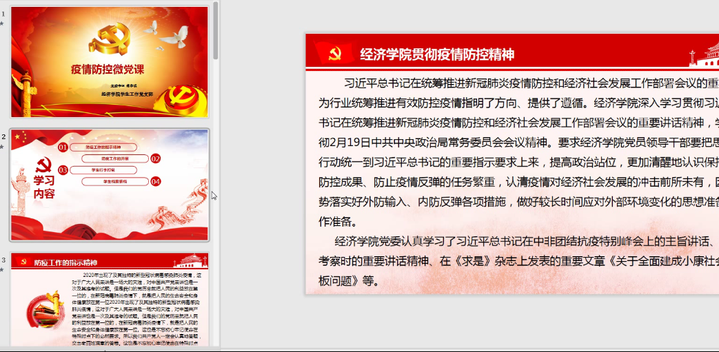 2020年7月3日下午,经济学院党委书记蒋孝洪为经济学院学生工作党支部所有党员同志上了一堂题为“疫情防控”的微党课。支部所有党员参加党课学习,并根据党课内容进行交流讨论,将疫情防控精神和工作要求内化于心,外化于行。