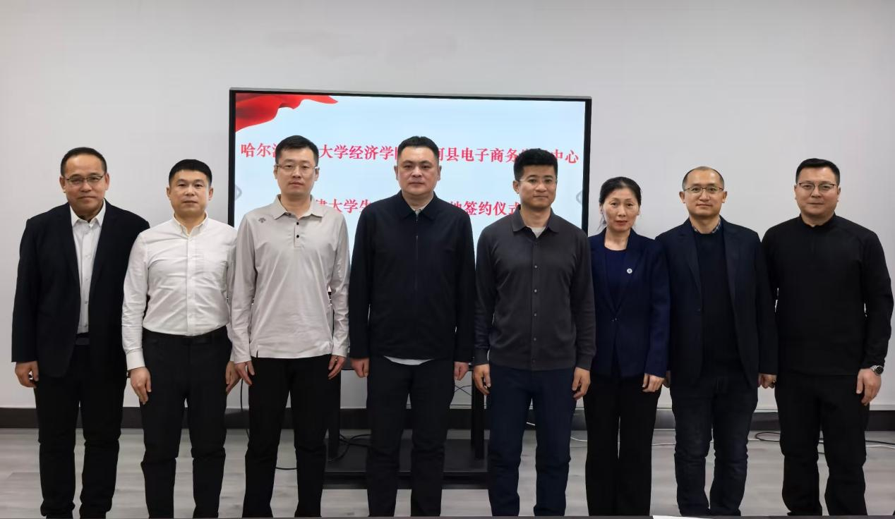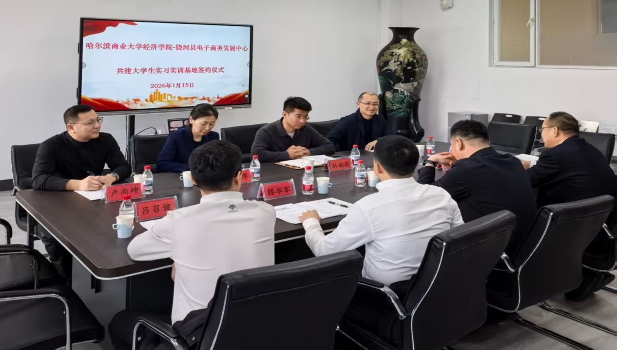 为进一步深化校地合作,共育新商科人才,搭建高校与地方资源共享、优势互补的合作平台。1月15日,哈尔滨商业大学经济学院与饶河县举行校地合作暨共建实习实训基地签约揭牌仪式。饶河县委常委、副县长辛延平,饶河县电子商务发展中心主任滕华军,外经贸主任吕召健,职教中心校长陈德新,经济学院院长韩朝亮,国际经济与贸易教研室主任张金萍,数字经济教研室主任尹龙,饶河援边教师卢尚坤出席会议。会议由韩朝亮主持。