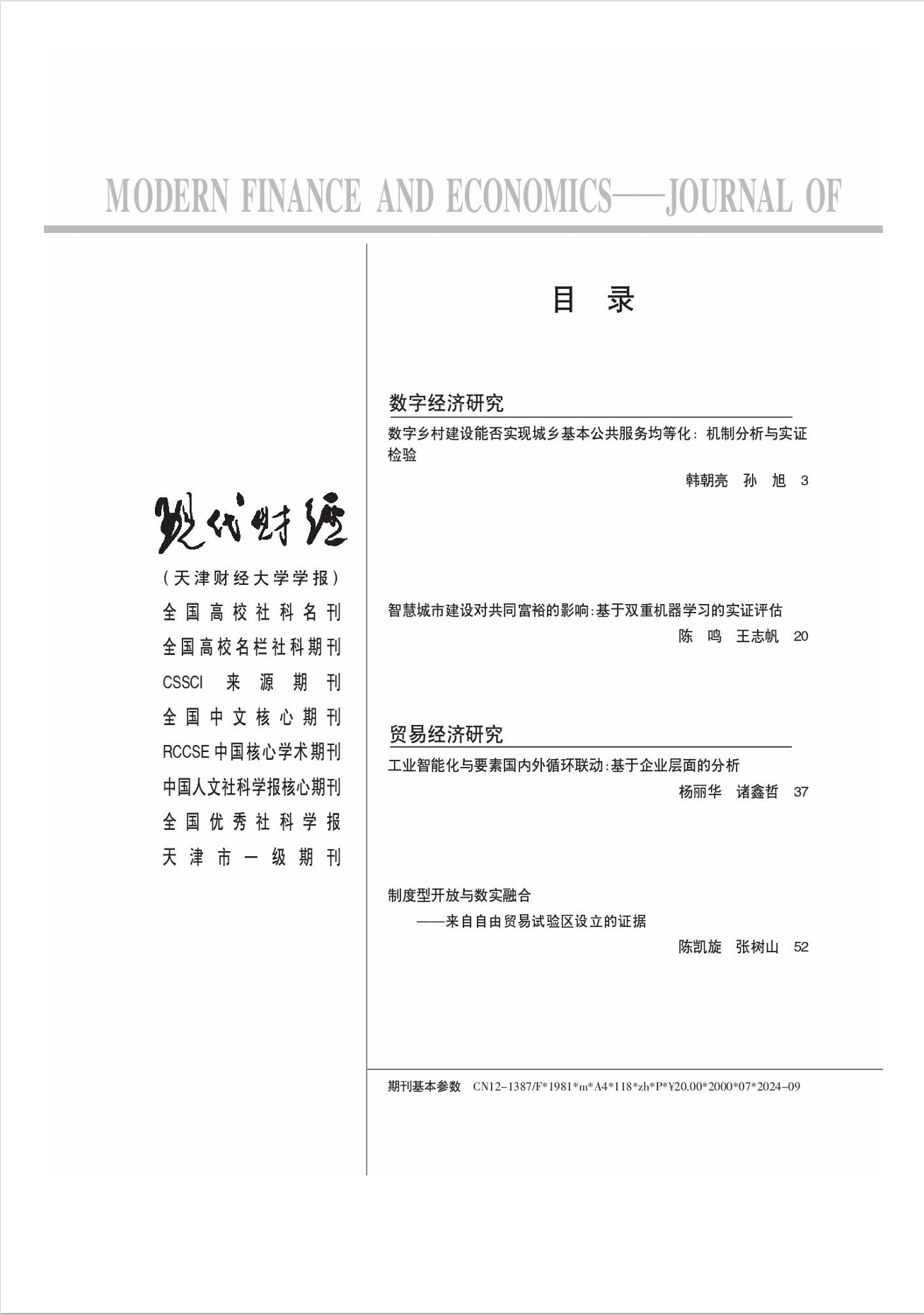 我院韩朝亮教授与其硕士生孙旭合作的论文《数字乡村建设能否实现城乡基本公共服务均等化:机制分析与实证检验》于2024年9月在经济学核心期刊《现代财经(天津财经大学学报)》发表。